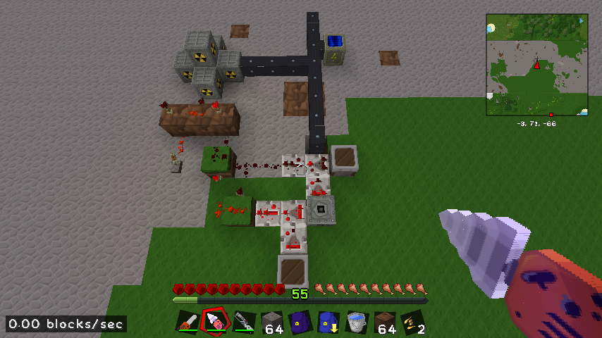 I posted it as suggestion, and I went ahead and replaced my chargepad with a regular MFSU (getting most of the diamond dust I needed from processing iridium from the Iridium Mod v0.6), but now I discovered a new setback: I had tested my setup in creative mode using lapotron crystals, but now that I've got it set up in survival mode, the redstone signal didn't change when the MFSU became full, though it did once I placed a dirt block next to the comparators, which I presume means that it doesn't perform block updates when powered via cable. I've attached an image of what my setup looks like from above. Is there something I can set up to automatically force a block update every few seconds for those comparators?