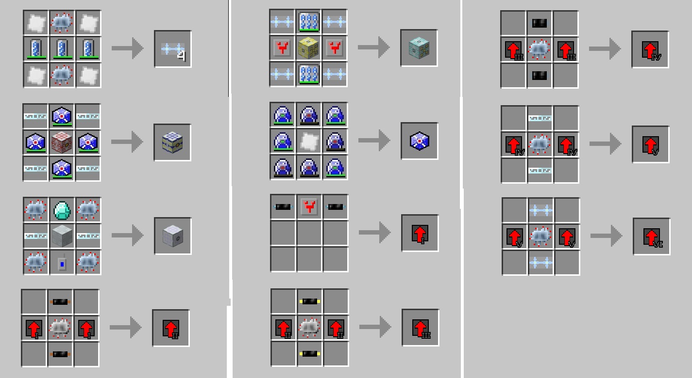 And the Wireless Energy Transfer Unit, which can send EU wirelessly, with input and output EU/t dependant on which Power Upgrade it has. The default is 8 EU/t input/output with no upgrades up to 32768 EU/t with the top upgrade. If you need more, then you'll have to connect more transfer units to the same channel. It also has an efficiency of 75% as sending the EU wirelessly uses a lot of energy. The channel network is tied to the player placing the block and should therefore not interfere with other player's channels.