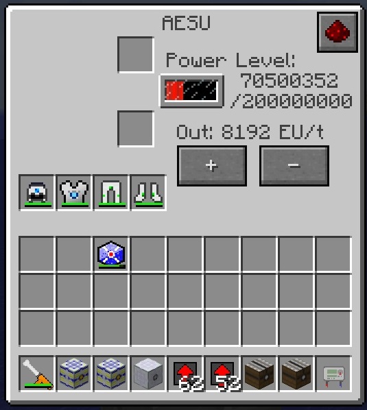 The Adjustable Energy Storage Unit (AESU), which can store 200M EU and has an adjustable output EU/t.