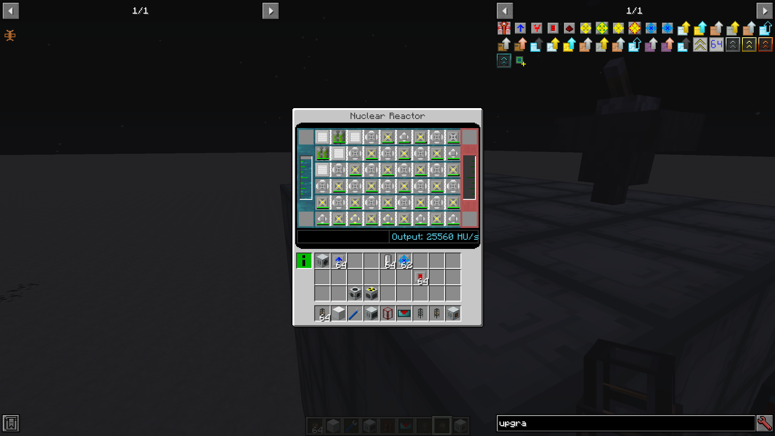 I was trying to get into the biogas and nuclear reactor topic. When i noticed the fermenters needed heat and fluid reactors exchange heat, this came into my mind. It creates a whopping 6.5k EU/t (+-), while only using 2 quad uranium cells per cycle and 1 biochaff every 8 seconds(+-). The reactor design itself isn't mine, i got it from the reactor tutorial post. It provides heat for (almost) 14 fermenters, fueling around 280 fluid fireboxes, each producing 32 HU/t, converted to 24 EU/t.