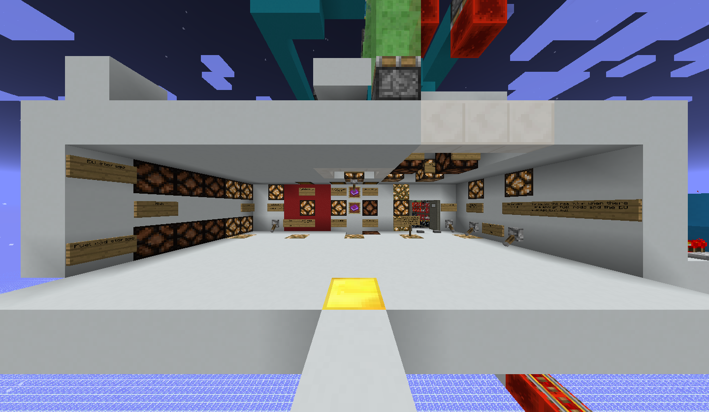 The reactor and automation circuits are built within a single chunk, but redstone related with the reactor control room (which are built in cyan concrete) and part of the redstone controlling the crafting system extends into another 3 chunks as I don't think not loading these will cause problem. I haven't tested what will happen if only the reactor chunk is loaded yet. Therefore the chunk loader within it is set to load all the 4 chunks. Slimestone is used in some parts when wiring is too difficult or I'm just too lazy to do the wiring. These can be replaced with redstone dusts. Also there are a chest with low durability rods at -1, 31, -1 if you want to watch how the fuel rod automation works. Remember to middle-click them ![]()