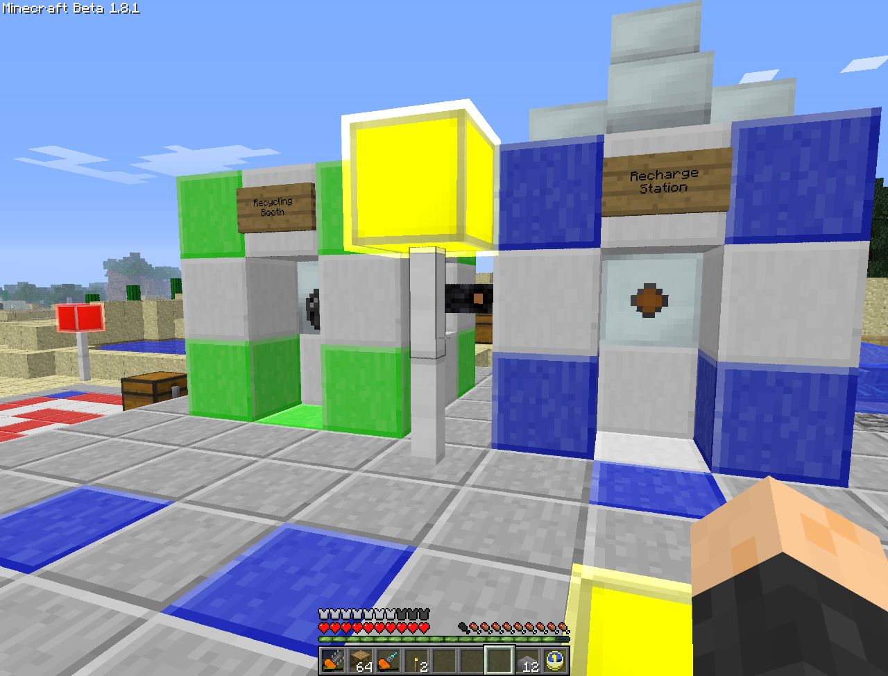 The recycle booth is powered by the recharging station (Not directly, it uses the solar panels), and the recharge station is just an MFE hooked up to 5 solar panels. They hang about for when I need them while out and about. 8)