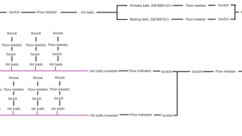 The way this works is that I have the power flow setup like this: energy source --> splitted to backup battery + Primary battery --> a EU flow wire (new in 1.337, it send an redstone signal when there is EU flowing through) --> a new raw of MFSU's ---> Secondary EU flow wire --> Machines.