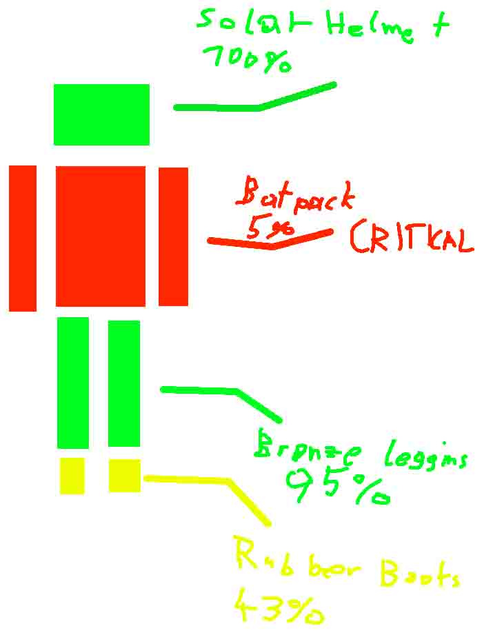 Here's my latest abomination - a display on your HUD of your armour and tool charge status. Shows the remaining durability (vanilla and ordinary armours), charge level (electric armours, batpacks, electric jetpacks) or fill level (chemical jetpacks, CF packs) of your currently equipped armour pieces, along with the charge/durability level remaining in your currently equipped tool. Stackable items display their name along with how many items are present in the stack. There is an option to display the item durability/charge as a percentage (accurate to 0.1%), along with the ability to show a snazzy colour-coded graphical overlay which is ultimately inferior to the text display in terms of precision.