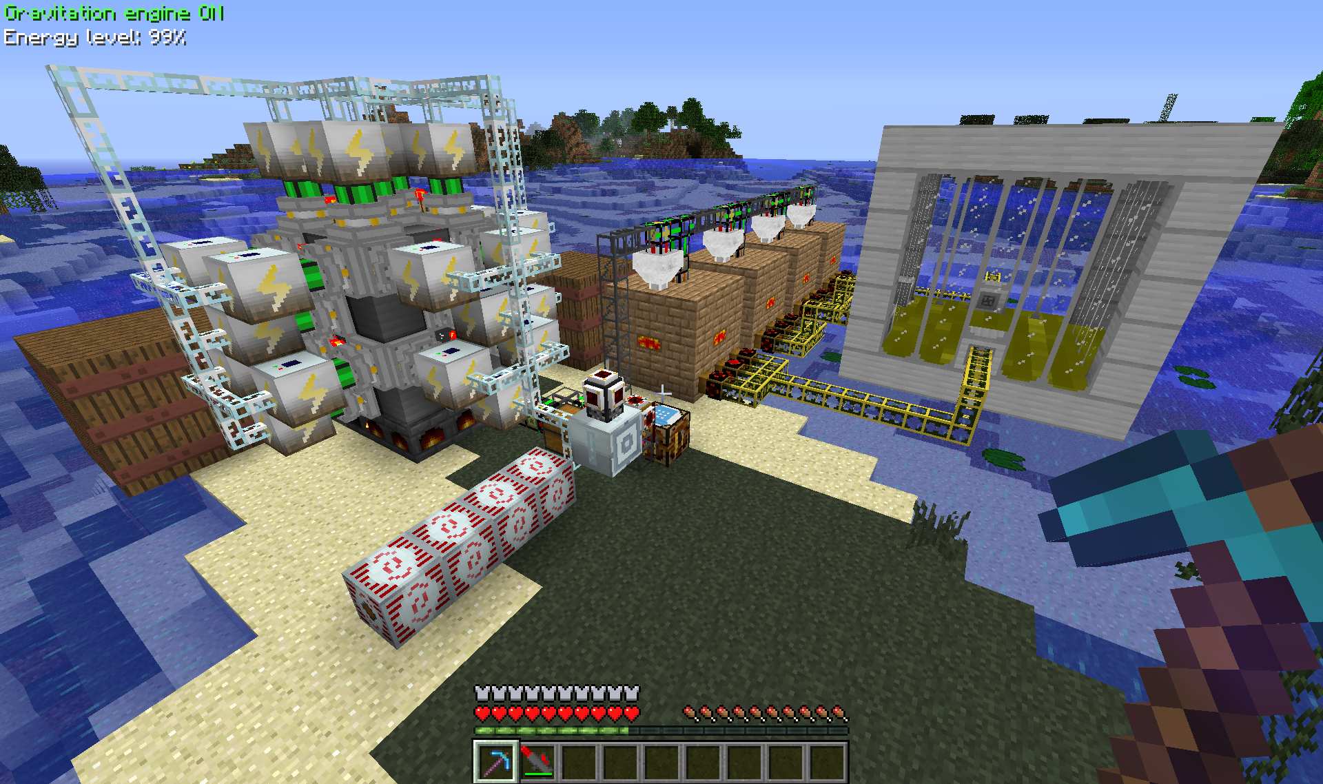Now, if I had a stick up my ass about efficiency, I'd probably use that tree farm to make scaffolds to burn in regular generators -- their operating cost would thus drop to "just some humus every once in a while", which is extremely low. But I don't honestly care that much, and playing with steam is fun.