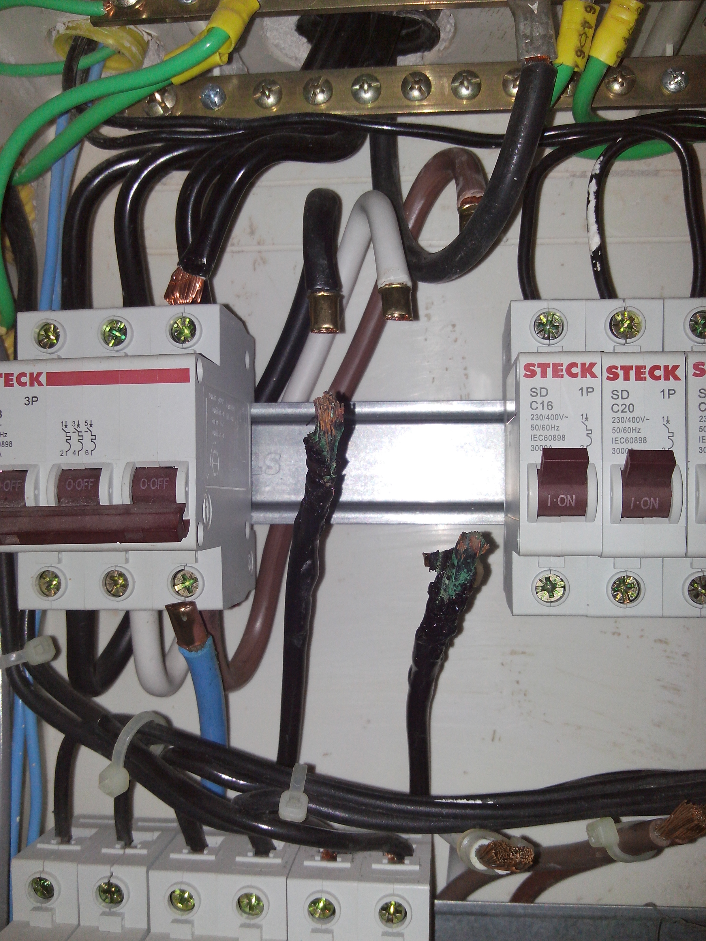 QuoteIt was the Residual Current Device (that big thing that was burned in one of the holes) that was defect and a mistake on the wiring.