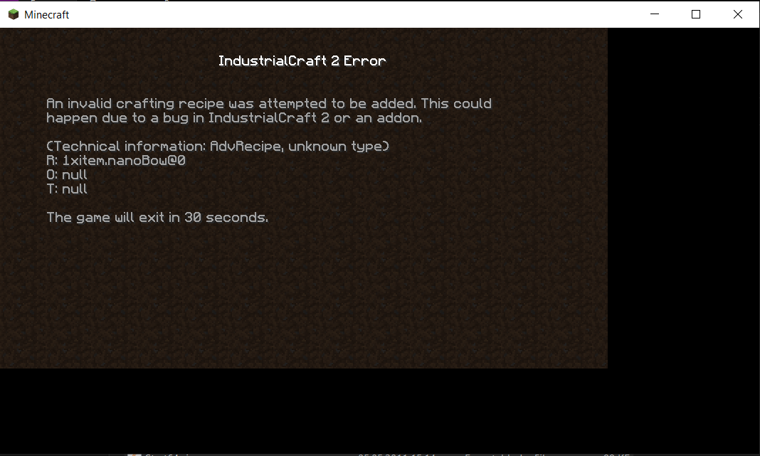 An invalid crafting recipe was attempted to be added. This could happen due to a bug in IndustrialCraft 2 or an addon.
